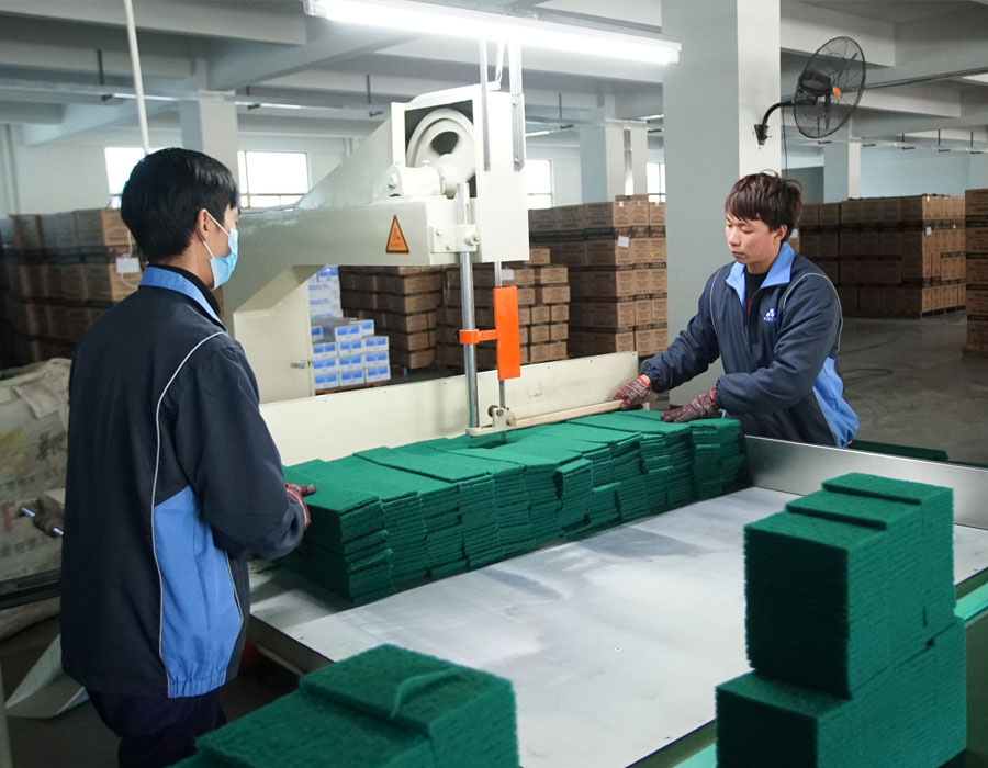 2个切割冲孔车间,日产能分别为5000平米和3000平米的海绵百洁布;